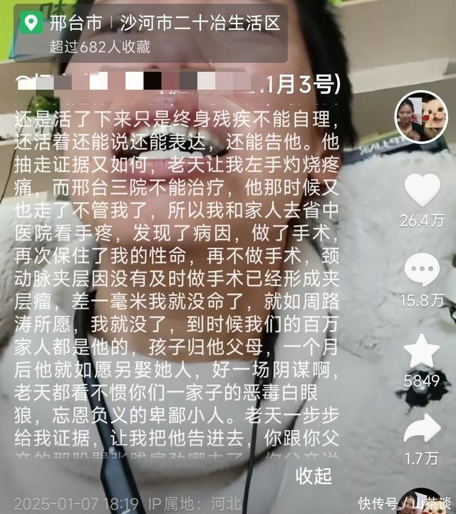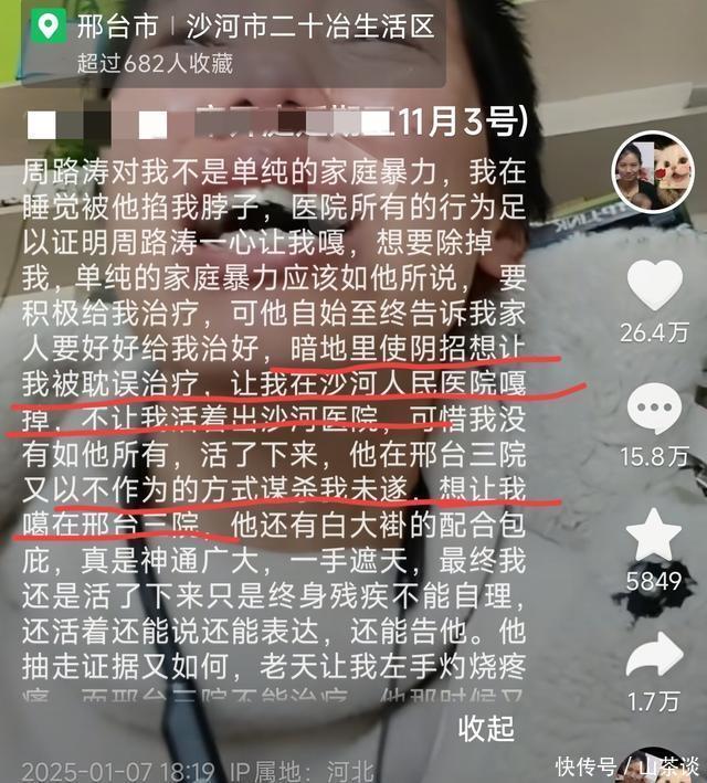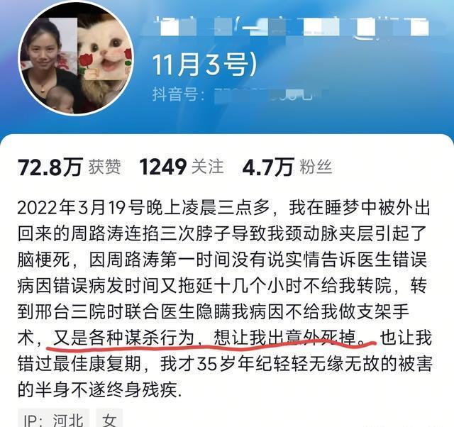 在就诊过程中,周某涛没有第一时间说出实情,他告诉医生错误病因、错误病发时间,拖延了十几个小时不转院,几经波折转到邢台三院时,周某涛又联合医生隐瞒病因,不给妻子做支架手术,想让杨宁宁出现意外死掉,错过了最佳康复期。 最后杨宁宁虽然做了手术,放了支架,命是保住了,但左半身瘫了,不能走路,也不能自己照顾自己了。