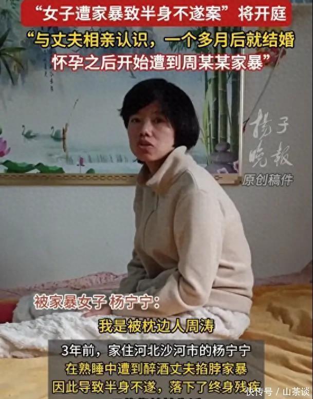河北女子杨宁宁今年38岁,3年半前被丈夫周某涛半夜掐脖3次,她千方百计逃离以后被确诊脑梗死,急需手术。在医治过程中,周某涛一直隐瞒病因,导致杨宁宁错过了最佳康复期,以至于后来半身不遂终身残疾。 儿子怀疑杨宁宁是装的,问妈妈是不是在演戏?女儿也出现了过激行为。这让杨宁宁悲痛不已,发誓要让丈夫周某涛付出代价。 11月1日,法治现场报道:11月3日,周某涛故意伤害杨宁宁案,将在河北省沙河市人民法院开庭。