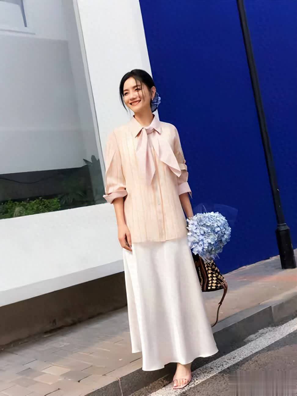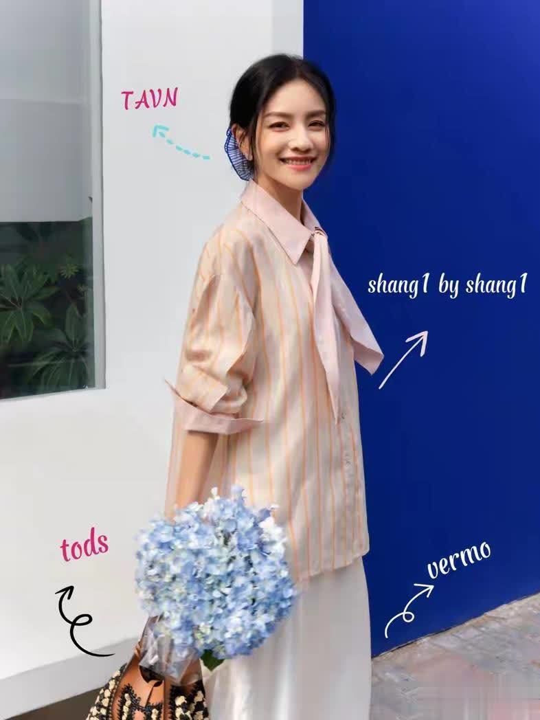 胡可这套粉棕条纹衬衫与白色缎面裙的组合,瞬间吸引了众人目光。粉棕条纹衬衫自带柔和滤镜,领口的飘带设计堪称点睛之笔,弱化了衬衫的正式感,增添了几分俏皮与温柔。衬衫是宽松版型,藏肉又显随性,袖口微微挽起,露出一截肌肤,细节中藏着松弛感,美不胜收。