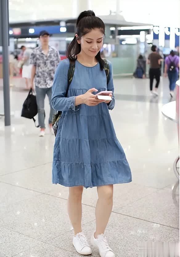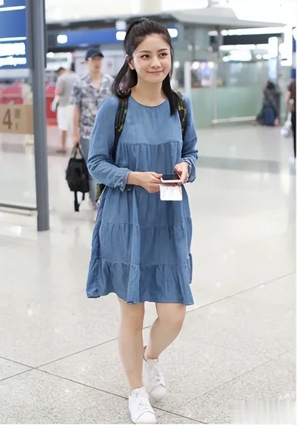在机场这类日常出行场景,胡可的牛仔娃娃连衣裙穿搭,更是把青春元气感狠狠拿捏了。牛仔面料自带休闲气质,娃娃裙的版型宽松又遮肉,结合蛋糕裙摆设计,走动时灵动俏皮,瞬间减龄十岁。
