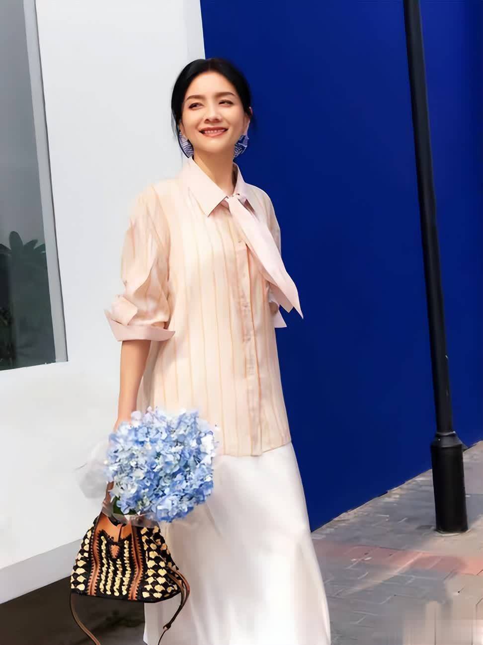 而且她头上的蓝色发饰与手中蓝紫色花束呼应,为整体温柔色调注入清新活力。这套搭配无论是周末逛艺术展,还是和好友下午茶,都能让人在温柔氛围里,美得毫不费力。